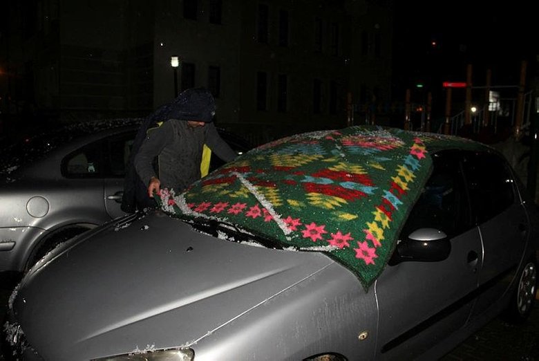 Afyonkarahisar’da gece yarısı aniden bastıran dolu yağışı sonrası her yer beyaza büründü. Fındık büyüklüğünde yağan dolu yağışı esnasında vatandaşlar battaniyelerle araçlarını korumaya çalıştı.