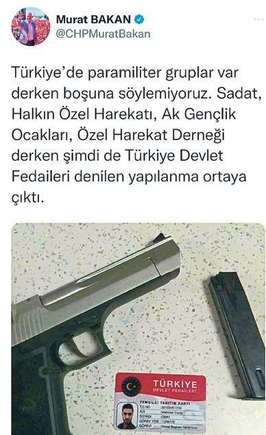 Murat Bakan da sosyal medya hesabından bu tanıtım kartı ile şarjörlü bir tabancanın fotoğrafını paylaşarak kirli planını devreye soktu. Bakan, "Türkiye'de paramiliter gruplar var derken boşuna söylemiyoruz. Sadat, Halkın Özel Harekatı, Özel Harekat Derneği derken şimdi de Türkiye Devlet Fedaileri denilen yapılanma ortaya çıktı. Bugün Torbalı'da kavga eden iki şahsa müdahale eden polis şahıslardan birinde bu kimliği buluyor. Şimdi de kendisine devlet fedaisi diyen, cebinde bu kimliği taşıyan, kimliğin üzerinde Cumhurbaşkanlığı forsu olan insanlarla aynı sokaklarda geziyoruz" dedi.
