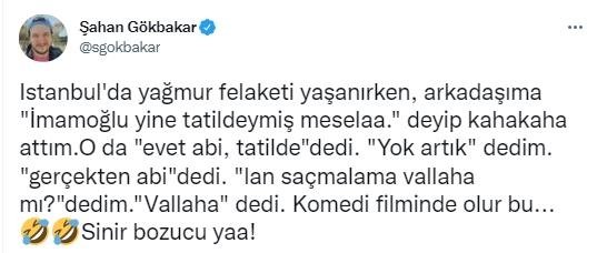 Yaşananların sadece komedi filminde olacağını söyleyen Şahan Gökbakar, şunları yazdı: "İstanbul'da yağmur felaketi yaşanırken, arkadaşıma 'İmamoğlu yine tatildeymiş mesela' deyip kahkaha attım. O da 'evet abi, tatilde' dedi. 'Yok artık' dedim. 'Gerçekten abi' dedi. 'Lan saçmalama vallaha mı?' dedim. 'Vallaha' dedi. Komedi filminde olur bu.. Sinir bozucu ya!"