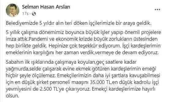 Emekçilerimizin daha iyi şartlara kavuşabilmesi için en düşük şirket personeli maaşını 35.000 TL'ye, en düşük kadrolu işçi yevmiyesini de 2.500 TL'ye çıkarıyoruz. Emekçi kardeşlerimize hayırlı olsun" dedi. Oysa Başkan Arslan, yaklaşık 1 yıldan bu yana emeklerinin karşılığını verdik dediği işçilere maaşlarını tam ve eksiksiz veremedi.