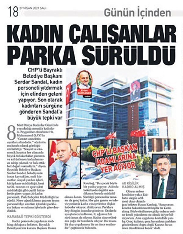 8 Mart Dünya Kadınlar Günü'nde "Kadınlarımız bizim için değerlidir" diyen İzmir Bayraklı Belediye Başkanı Serdar Sandal, nisan ayında 23 kadın büro elemanını Park Bahçeler Müdürlüğü'ne sürdü. SABAH haberi "Önce kutladı, sonra sürgüne yolladı" başlığı ile manşetine taşıdı. Haberin ardından belediyede örgütlü Genel İş Sendikası devreye girdi.