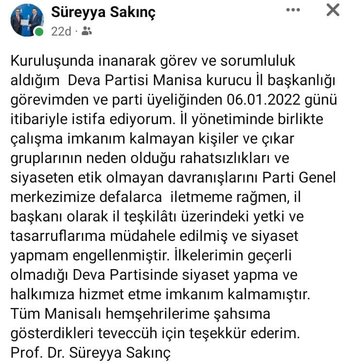 DEVA Partisi Manisa İl Başkanı Prof. Dr. Süreyya Sakınç, sosyal medya hesabından yaptığı paylaşımla hem başkanlıktan hem de partiden istifa ettiğini duyurdu.