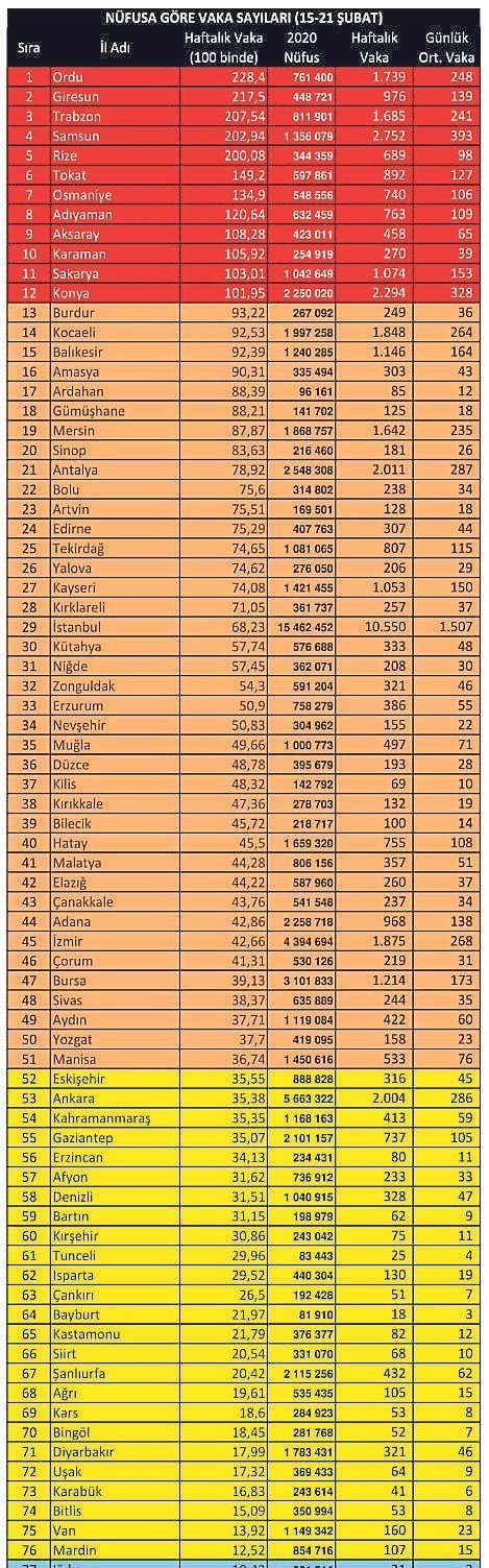 Sağlık Bakanlığı Koronavirüs Bilim Kurulu bu konudaki çalışmalarını sürdürürken, il bazında vaka sayıları da büyük önem kazandı. Kafe ve restoranların açılması, sokağa çıkma kısıtlamaları ve yaş gruplarına göre kısıtlamaların kaldırılmasında en önemli kriter, illerin 100 bin kişide görülen haftalık vaka sayıları olacak. Her hafta yenilenecek olan tabloda son duruma göre aralarında Ordu, Giresun, Trabzon, Samsun, Rize, Adıyaman ve Sakarya'nın da bulunduğu 12 il 'Yüksek Riskli' olan kırmızı kategoride yer alıyor.