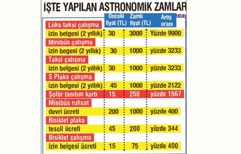 Soyer'in geçtiğimiz 14 Haziran'daki belediye meclis toplantısında aldırdığı kararla taksiden servise, minibüsten bisiklete kadar ticari araç gruplarından belediye tarafından alınan çalışma izin belgesi (ruhsat) ve güzergah izin belgesi ücretlerine yüzde 10 bine yaklaşan oranlarda zam yapıldı. En fazla zam yapılan 2 yıllık lüks taksi çalışma izin belgesi oldu. Soyer, 30 lira olan bu ücreti tam yüzde 9 bin 900 artırarak 3 bin liraya çıkardı.