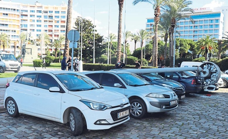 İZMİR'İN Konak ilçesinde de 25 metrelik aydınlatma direği, kuvvetli rüzgar nedeniyle park halindeki araçların üzerine devrildi. Cumhuriyet Meydanı'nda öğle saatlerinde yaşanan olayda, aydınlatma direği kuvvetli rüzgar nedeniyle park halindeki araçların üzerine devrilirken, 5 araçta büyük maddi hasar meydana geldi.