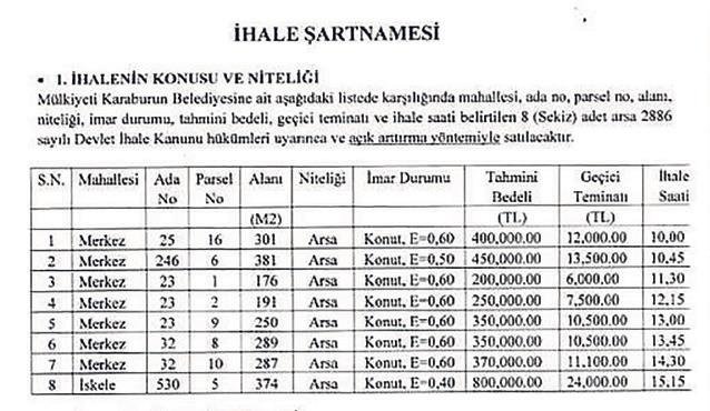 Karaburun Merkez Mahallesi'nde 7 ve İskele Mahallesi'nde 2 olmak üzere 9 arsanın satışı gündeme getirildi. 3 milyon 170 bin lira muhammen bedelle satışa çıkarılan arsalar için 18 Haziran'da ihale yapılacak.
