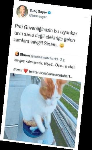 İzmir Büyükşehir Belediye Başkanı CHP'li Tunç Soyer, bir tramvay istasyonundaki elektronik kart basma cihazının üzerinde oturan ve ulaşım kartını okutmak isteyen Sinem isimli genç kıza izin vermeyen sokak kedisinin komik videosu üzerinden 'elektrik zammı' algısı yapmak istedi, İzmirlilerin tepkisi ile karşılaştı. Soyer videoya 'Pati güvenliğimizin bu isyankar tavrı sana değil, elektriğe gelen zamlara sevgili Sinem' notunu düştü ancak vatandaş da paylaşımın altına adeta açtı ağzını yumdu gözünü. Vatandaşlar İzmir'de Türkiye'nin en pahalı suyunu kullandıklarına dikkat çekti.