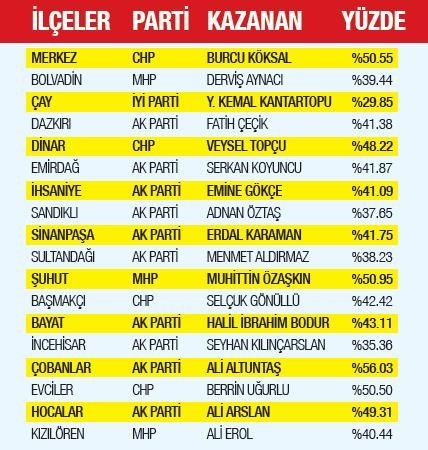 Afyonkarahisar'da 17 ilçe ve 40 belde belediye başkanlığı için 210 bin 233 seçmen sandık başına gitti. CHP'li Burcu Köksal yüzde 50,73'lük oranla belediye başkanı seçildi. AK Parti adayı Hüseyin Ceylan Uluçay yüzde 31,9 oy oranıyla seçimi ikinci sırada tamamladı.