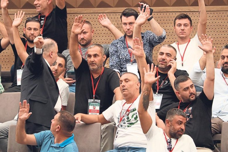Yeni yönetim kurulu, seçilmesinin ardından salondaki üyelerle birlikte topluca "Kaf-Kaf" tezahüratı yaptı