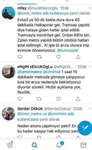Öte yandan Çankaya İstasyonu'ndan trene binen ismini vermek istemeyen bir yolcu, "Tren Çankaya'dan hareket etti. Basmane'ye geldik. Saat 19.05 gibi arıza yaşandı. 1 saatte Halkapınar istasyonuna vardık" dedi. Sosyal medyada tepki paylaşımı yapan İzmirliler, "Biz böyle kötü hizmeti hak etmiyoruz" diye konuştu. Arıza anında bazı yolcular trenden inerek diğer ulaşım araçlarını kullandı.