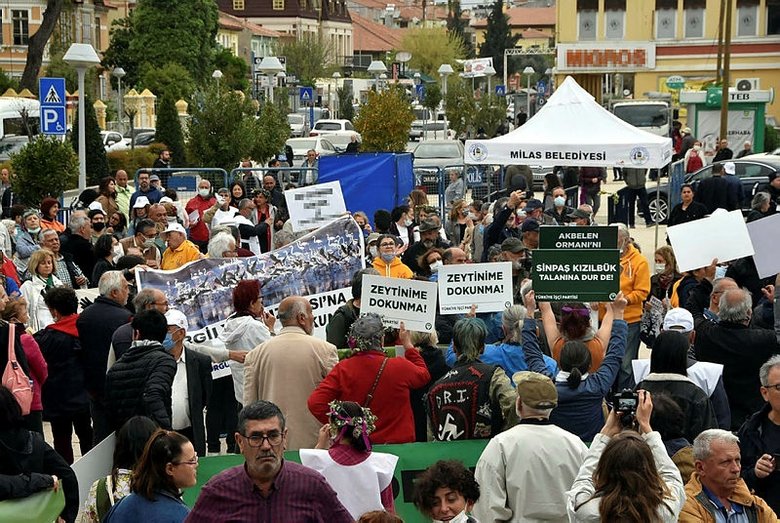 Milas Atapark Meydanı'nda toplanan yüzlerce kişi 'Zeytinime dokunma', 'Zeytin hayattır' dövizleri taşıyıp, slogan atarak yürüyüş yaptı. Mitingde kürsüye çıkan CHP'li Milas Belediye Başkanı Muhammet Tokat ise çevrecilerin tepkisi ile karşılaştı.
