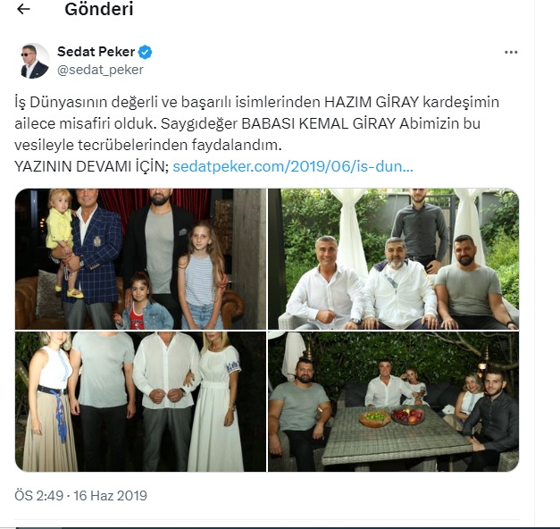 16 Haziran 2019 tarihinde sosyal medya platformu X'teki hesabından bir paylaşım yapan suç örgütü lideri Sedat Peker, Giray ile bir araya geldiklerini belirtiyor. Giray ve yakınlarıyla çekilmiş 4 fotoğrafını paylaşan Peker’in “İş Dünyasının değerli ve başarılı isimlerinden HAZIM GİRAY kardeşimin ailece misafiri olduk. Saygıdeğer BABASI KEMAL GİRAY Abimizin bu vesileyle tecrübelerinden faydalandım.” İfadelerini kullandığı görülüyor.