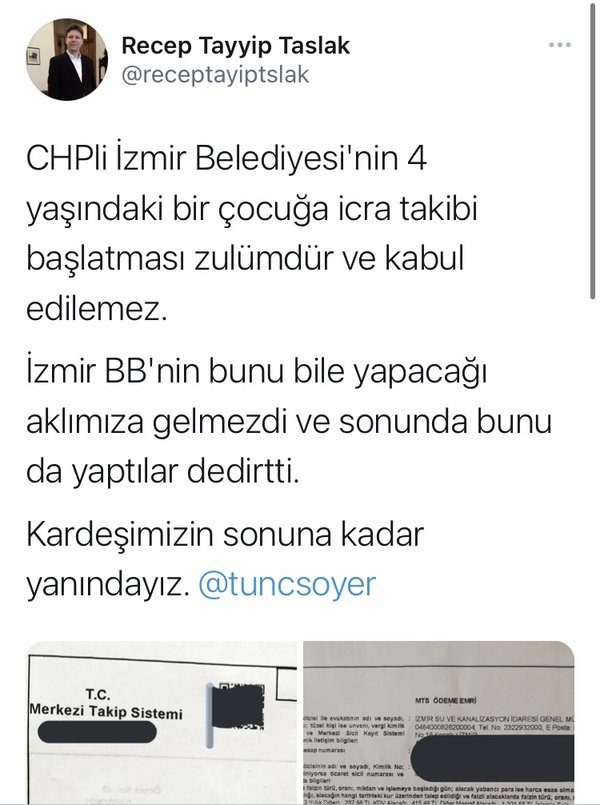 AK Parti İzmir Gençlik Kolları İl Başkanı Recep Tayyip Taslak da; "CHP'li İzmir Belediyesi'nin 4 yaşındaki bir çocuğa icra takibi başlatması zulümdür ve kabul edilemez. İzmir BB'nin bunu bile yapacağı aklımıza gelmezdi ve sonunda bunu da yaptılar dedirtti. Kardeşimizin sonuna kadar yanındayız" dedi.