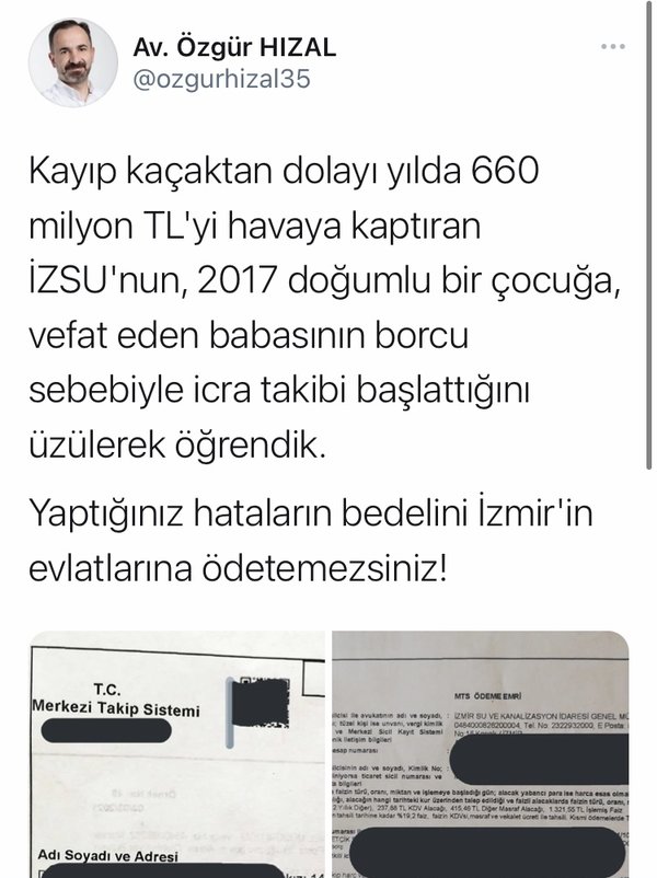 İzmir Büyükşehir Belediyesi AK Parti Grup Başkanvekili Avukat Özgür Hızal, "Kayıp kaçaktan dolayı yılda 660 milyon TL'yi havaya kaptıran İZSU'nun, 2017 doğumlu bir çocuğa, vefat eden babasının borcu sebebiyle icra takibi başlattığını üzülerek öğrendik. Yaptığınız hataların bedelini İzmir'in evlatlarına ödetemezsiniz!" dedi.